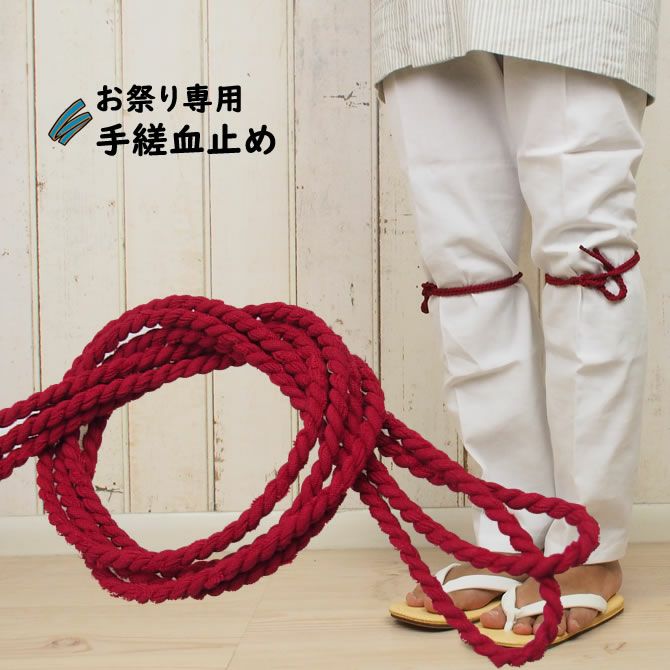 江戸時代に飛脚や篭屋が長距離を走る際に、ひざの下にヒモをきつく巻いて、うっ血を防止する役割で使用されるようになった血止め。現在ではお祭り衣装のワンポイントファッションとして使用されています。