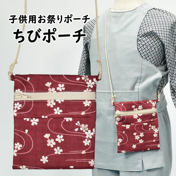 ちびポーチ 子供用お祭りポシェット 波に桜 エンジ
