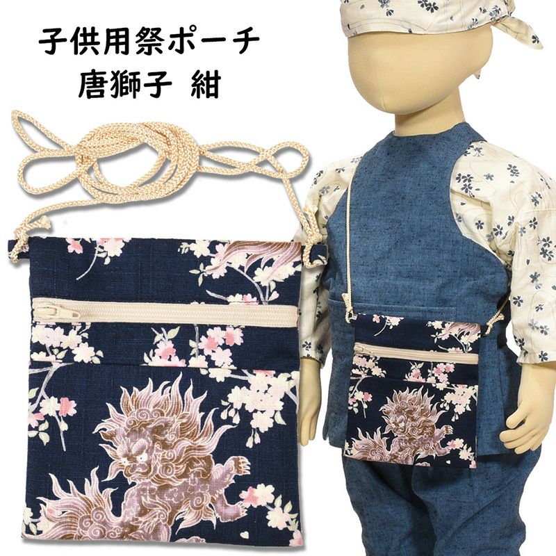 ちびポーチ 子供用お祭りポシェット 唐獅子 紺