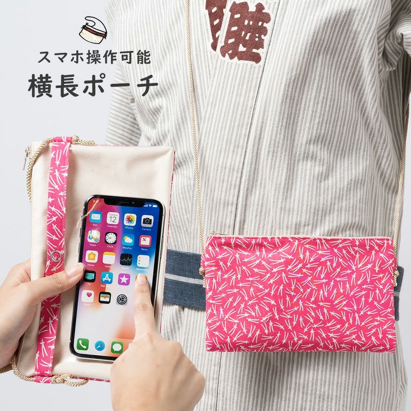 スマートフォンを裏の透明ポケットに入れたまま操作することができるスマホ操作対応のお祭り専用ポーチ(ポシェット)です。