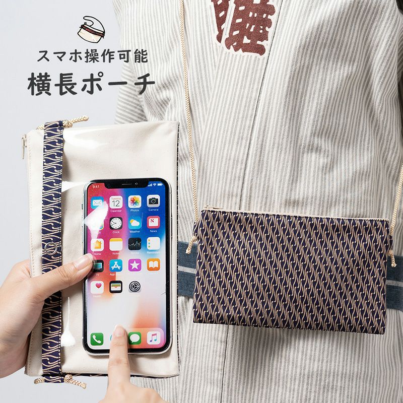 スマートフォンを裏の透明ポケットに入れたまま操作することができるスマホ操作対応のお祭り専用ポーチ(ポシェット)です。