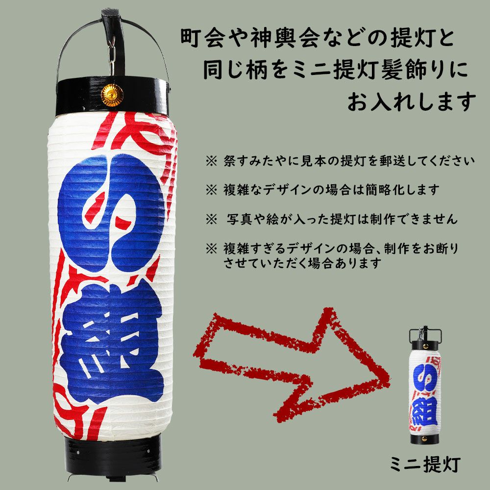 【5】 完成次第、ミニ提灯髪飾りとお預かりしていた見本の弓張提灯を一緒にお送りさせていただきます。見本の弓張提灯を先にご返却をご希望の場合は、送料がお客様ご負担になりますのでご了承ください。(送料着払いで見本の弓張提灯をご返送させていただきます。) |