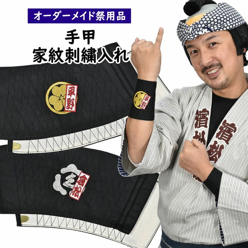 祭すみたやで販売している「手甲」に家紋と名前(短冊付き)を刺繍でお入れいたします。