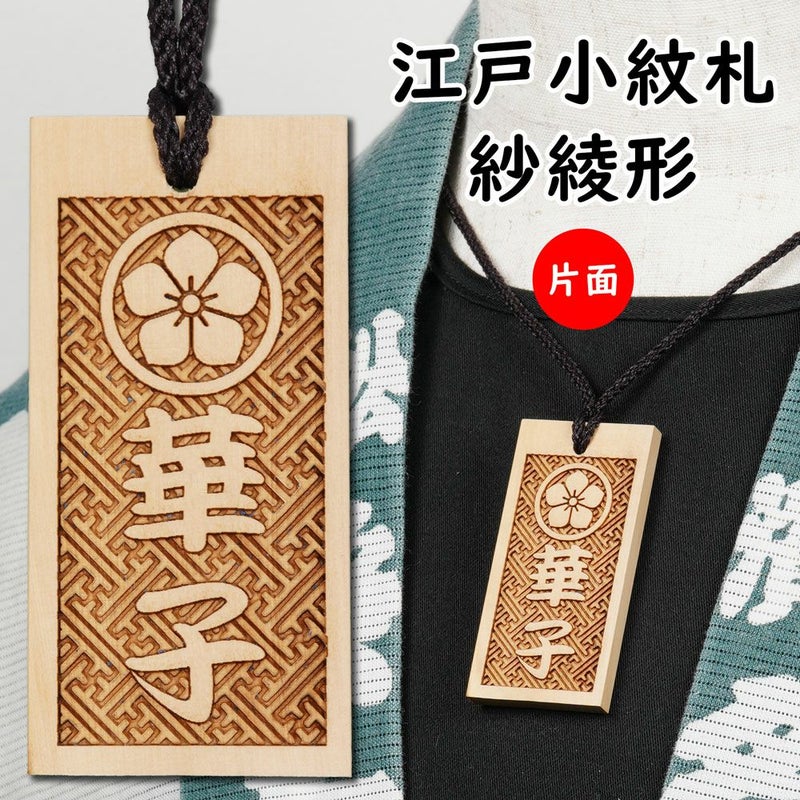 紗綾形の柄の入った木札の片面にお好きな文字と家紋またはマークをレーザー彫刻でお入れいたします。