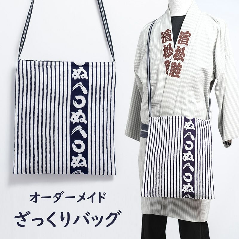町内や神輿会で配られた手ぬぐいやお好きな生地を当店宛てに送ってください。生地到着次第、「ざっくり斜め掛けバッグ」の形に加工縫製いたします。