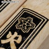 拍子木の左右両方にお好きな文字や家紋、マークをレーザー彫刻でお入れいたします。彫刻後、文字のまわりを黒色に着色します。