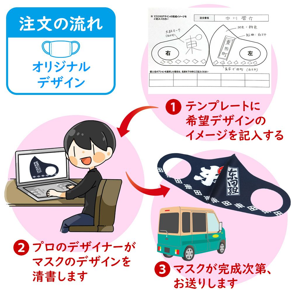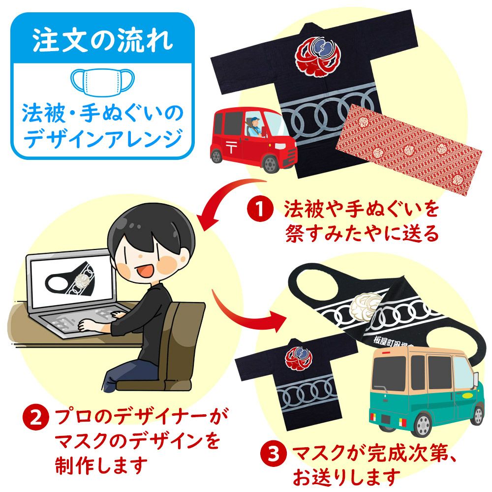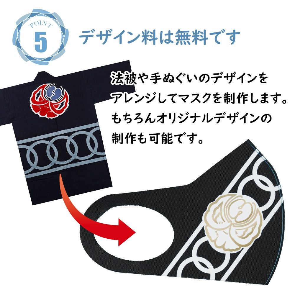 特注オーダーメイドで制作するお祭りマスクの商品一覧です。お祭りで市販の無地のマスクを付けると、ちょっと雰囲気に合わないんですよね。お祭りによく似合うマスクをオーダーメイドで制作します。お好きなデザインをフルカラーでプリントして制作する立体マスクと、お客様の手ぬぐいを裁断・縫製して制作するマスク縫製があります。