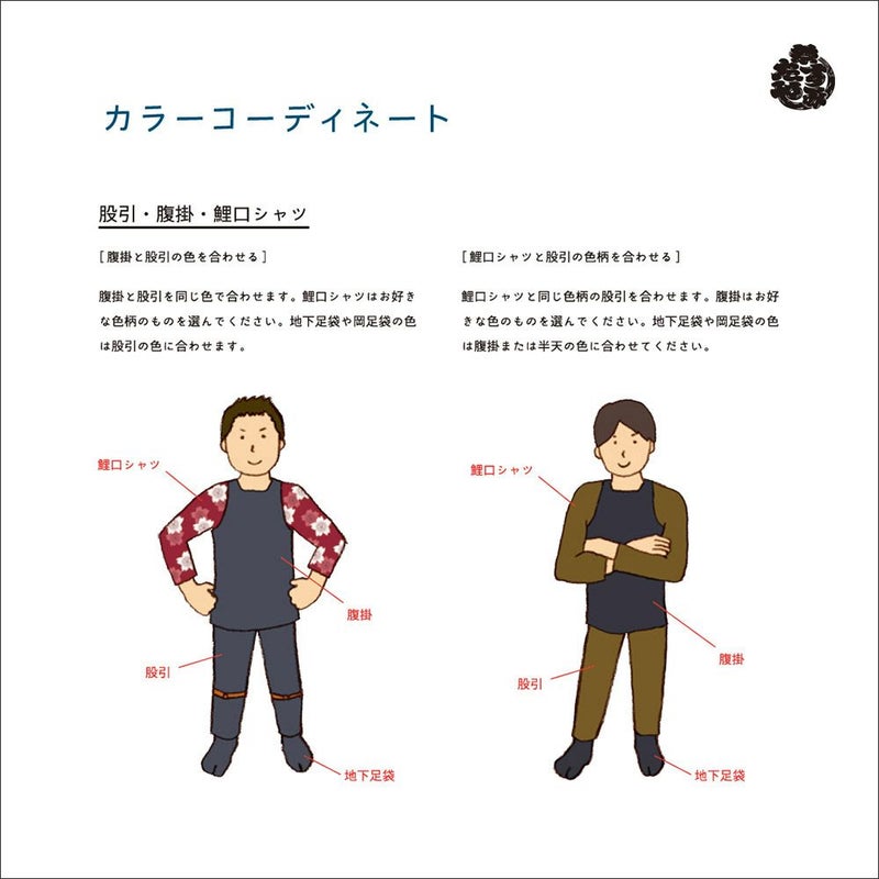 お祭り衣装の色の合わせ方を解説しているリーフレットです。腹掛・股引・足袋・帯の色の選び方についてアドバイスしております。
