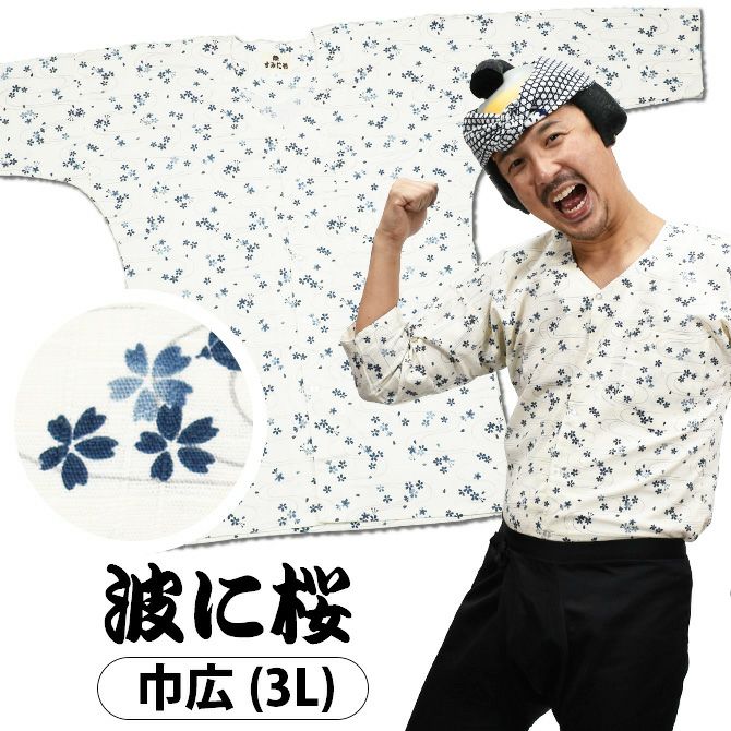 祭すみたや 鯉口シャツ 波に桜 ベージュ 巾広(3L)