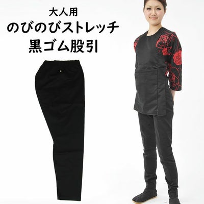 身長168cm、ウエスト110cmで先月、巾広サイズの「のびのびストレッチ白ゴム股引(ズボン)」を購入し、着用したところ脚にピタッとフィットし膝を曲げる際、生地が伸びるので動きやすく気に入ってしまい、今度は色違いで黒ゴム股引(ズボン)を購入しました。鯉口シャツの柄に合わせて、白色と黒色のゴム股引を使い分けしようと思います。